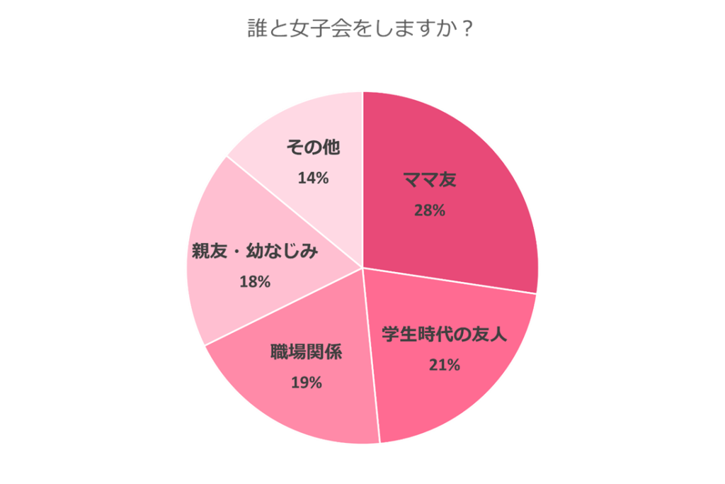 誰と女子会をしているか?という質問に対して、回答は「ママ友」が28%と最多を占めていました。次いで「学生時代の友人(21%)」、「職場関係(19%)」、「親友・幼なじみ(18%)」と続きます。