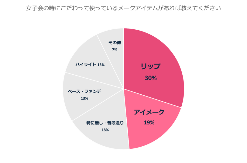 「女子会の時にこだわって使っているメークアイテムは?」という質問に対しての回答では、「リップ」と「アイメーク」でほぼ半数を占めます。「リップ」は「落ちないリップ」が最も重要のようです。「アイメーク」は“目元のキラッ”で差をつけるラメ・キラキラや強発色パレットの指名が多く、華やかさと写真映えを意識した選びが大事との回答が目立ちました。