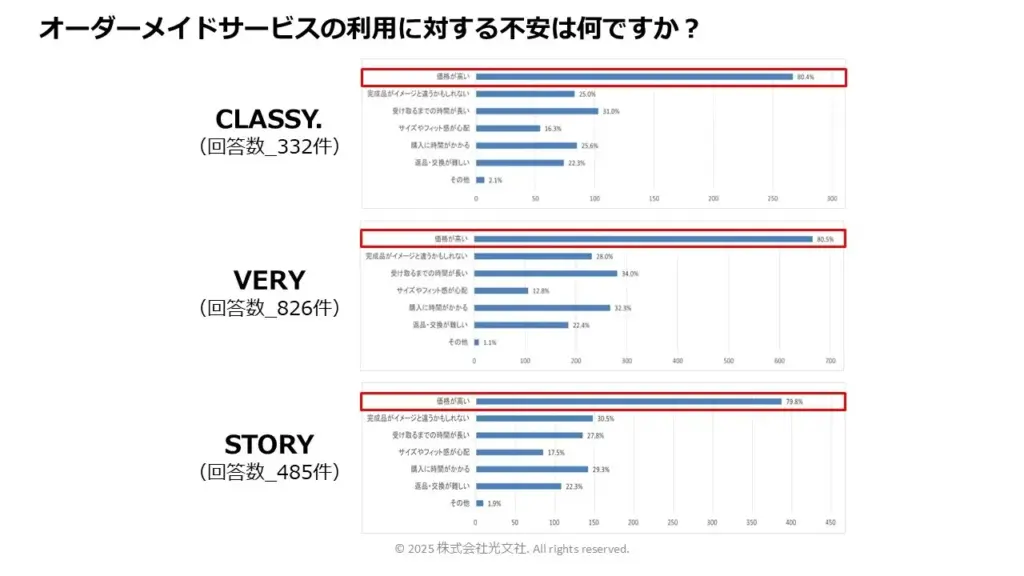- 3誌すべてで、「オーダーメイドは価格が高そう」との回答が約80%。