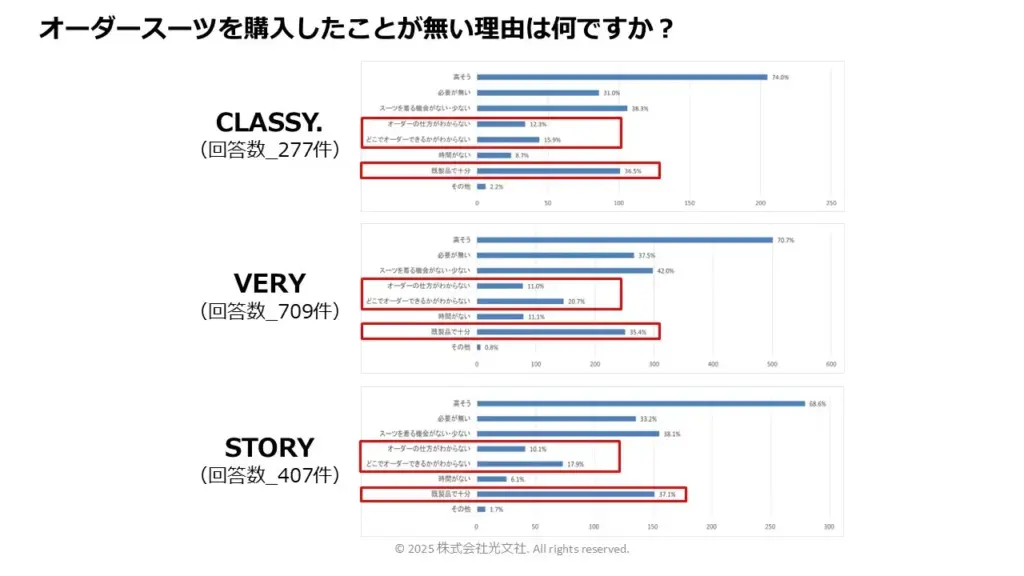 - オーダースーツの価格に対する不安以外にも、そもそも「どこで買えばいいのかわからない」、「オーダーの仕方がわからない」との回答が、各誌ともに約30%。